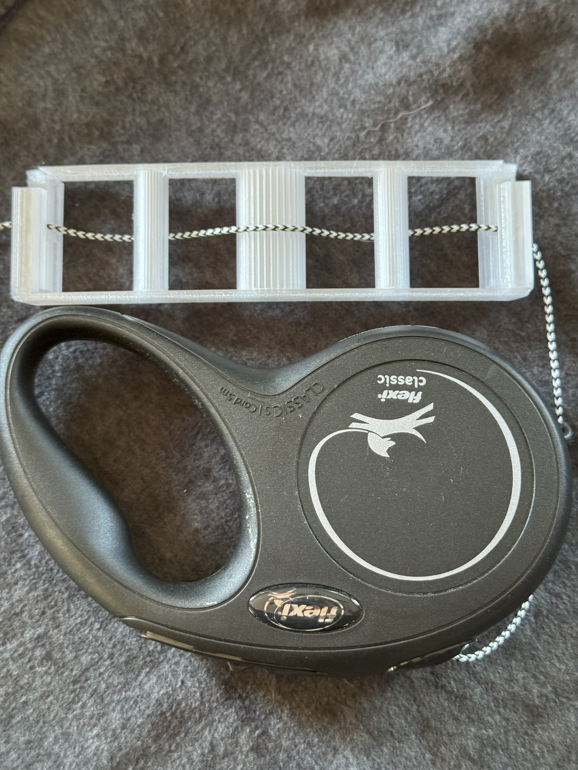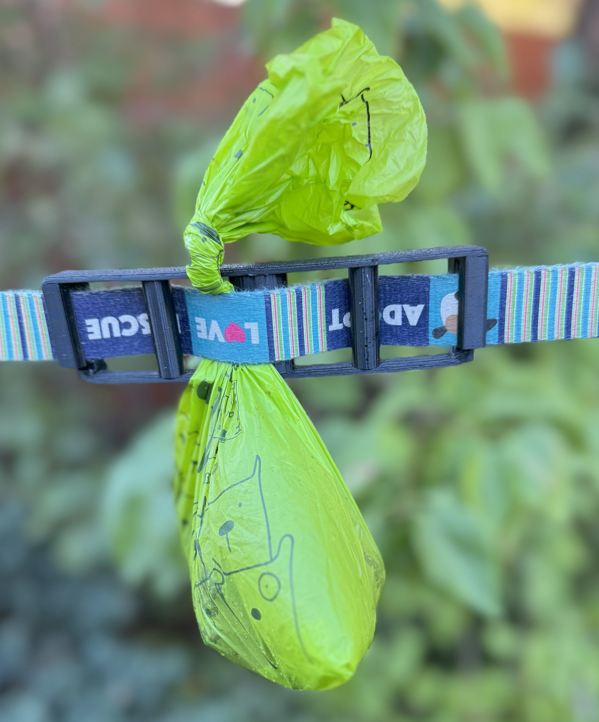 Poop Noose works with most leashes, but was designed specifically with strap and rope style leashes in mind. You simply wind the leash through the device, and if you have a strap or retractable leash, you slide it into the guides at both ends, and BOOM! you will never have to carry a poop bag again. Poop Noose uses the tension of the leash against the device to hold poop bags solidly in place. It can even carry multiple full bags at the same time!